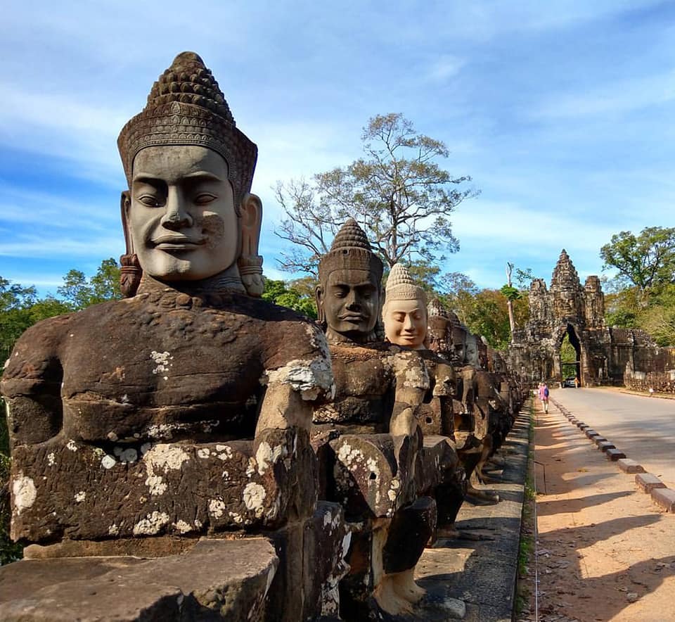 Vous continuez la visite par la porte sud d’Angkor Thom, flanquée de part et d’autre d’une rangée de 54 statues de pierre (des dieux à droite et des démons à gauche) ainsi que la ville fortifiée d’Angkor Thom. Ensuite, visitez temple Bayon (XIIe siècle), vous pourrez admirer ses tours centrales magnifiquement sculptées que couvrent 200 énormes visages. Vous explorerez ensuite le Palais Royal, la Terrasse des Eléphants, le Baphoun (temple du 11ème siècle avec un grand Bouddha couché), Phimeanakas et la Terrasse du Roi lépreux.